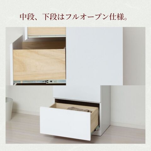 引出しは全てレール付で出し入れラクラク。また深型はフルオープン仕様です。