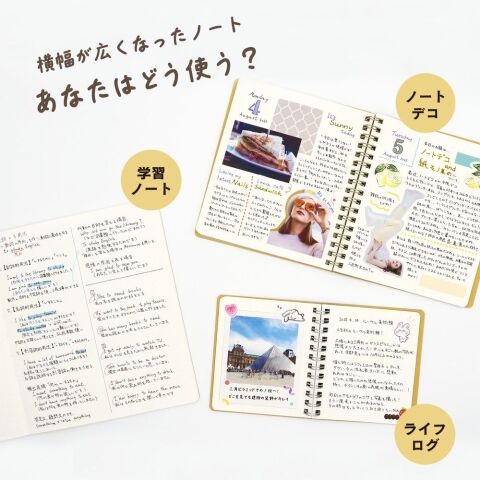 従来のノートより幅が広がったことで、シールや写真を貼り付けても文字を書くスペースは十分に確保。分割線を引いてもゆったり書ける。