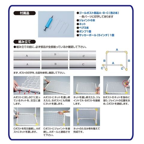 ゴールポスト、ジョイント、ネットを組立て、付属のポンプで簡単組立!
