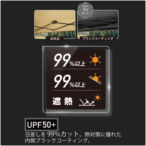 ◆天幕内側はブラックコーティング仕様で遮熱効果アップ。