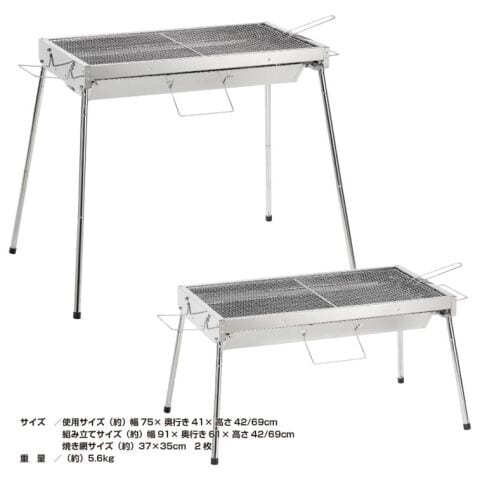 • 材質:[本体]ステンレス [焼き網、脚]スチール(クロムメッキ) [本体ハンドル]鋼(亜鉛メッキ) [焼き網ハンドル]スチール