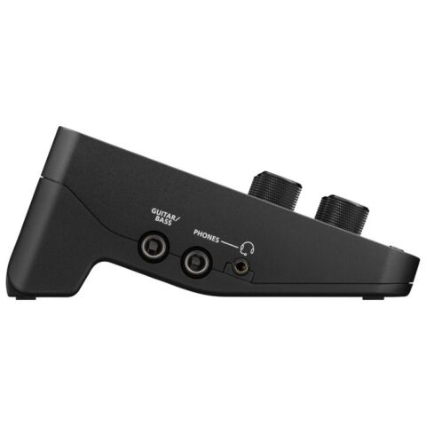 入力端子は、XLRマイク入力(2系統)、ギター/ベース入力、LINE入力、AUX入力、ヘッドセットマイク入力、TRS MIDI入力、USB入力を搭載。