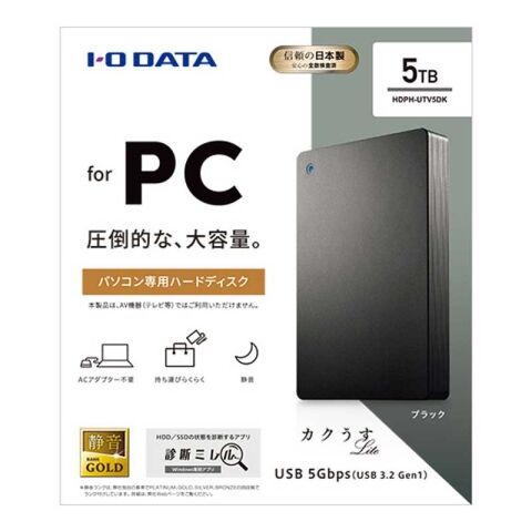 ハードディスク アイ・オー・データ機器|I-O DATA 大容量 USB 5Gbps(USB 3.2 Gen1)対応 ポータブルハードディスク「カクうす Lite」5TB(ブラック) HDPH-UTV5DK 【返品種別B】