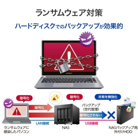 NASのデータをハードディスクにバックアップし、ハードディスクを読み書きできないようにしておくことで、データをランサムウェアから守ることができます。