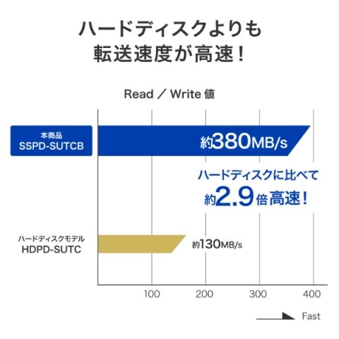 本商品「SSPD-SUTCBシリーズ」はSSDを搭載しているため、ハードディスクモデル「HDPD-SUTCシリーズ」と比べるとデータの転送速度が速く、より快適にご使用いただけます。