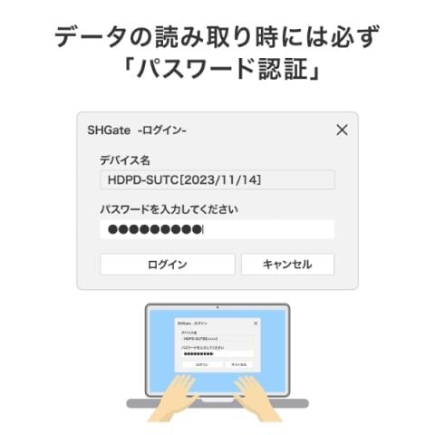 正しいパスワードを入力しない限り、本商品に保存されているデータには一切アクセスできないので、盗難や紛失時にも内部のデータを守ることができます。
