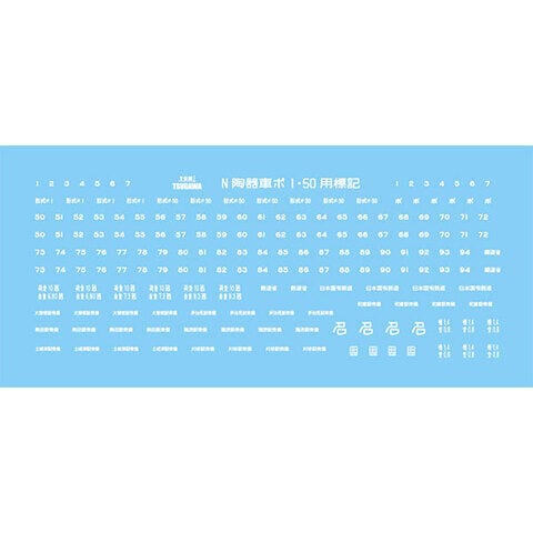 津川洋行Nスケール用パーツ、ポ50形貨車 陶器車 標記インレタ(印刷色:白・1枚入)です。