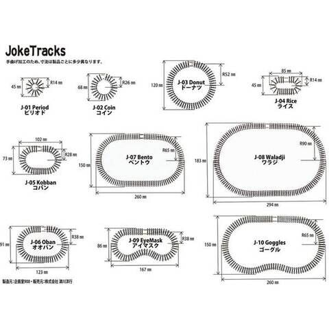 走行可能車両:ピリオド・ライスは軸距10mmまでの2軸動力車走行可能 コバン以上は軸距28mmの2軸動力車走行可能 ボギー台車車両はワラジ推奨 車両の仕様により軸距内であっても走行できないことがあります。 編成・牽引走行はベントウ以上推奨、車両数は車両など条件により異なります レール固定の際には、ジョイント部分のズレと平行に注意すること。 極小カーブレール特有の走行条件により埃などを吸着しやすくなることがあります。通常よりもこまめにレールとホイルクリーニングをおこなってください。 手曲げ加工のため、寸法は製品毎に個体差があります。予めご了承ください。