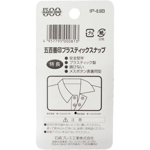 ◆肌に直接触れるような場所への取り付けでも安心のプラスチックスナップボタンです。