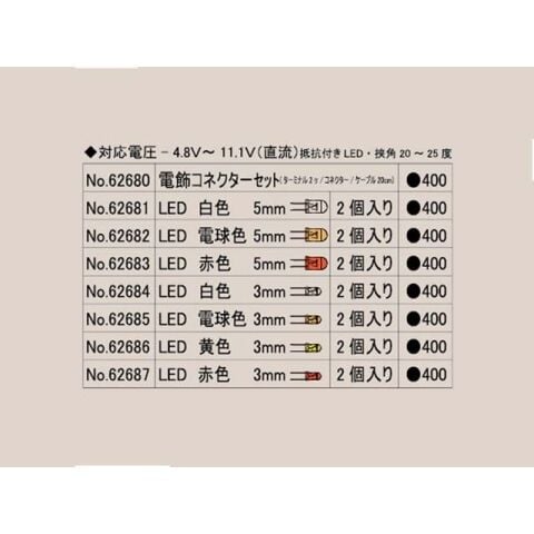 • 対応電圧:4.8V~11.1V(直流)、抵抗付きLED・挟角 20~25度