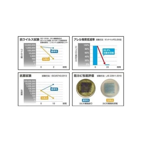 ウイルスカット アレブ物質ブロックポリフェノール配合不織布により、標準布と比較して、フィルターに吸着されたウイルスを99.9%以上現象。