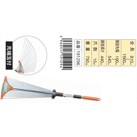 ◆軽量アルミハンドルを採用した、スライド機能とハンドルの伸縮機能付(先幅190~540mm・全長810mm~1560mm)清掃、整地作業用レーキ。