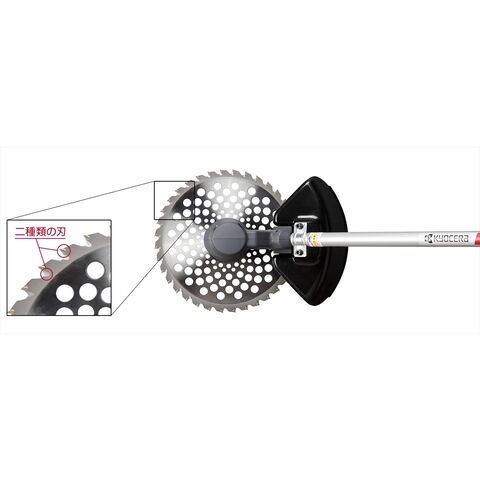 ◆密集した草地に優れた切れ味の「ダブルカットチップソー」で効率良く草刈り。キワに残った草は「樹脂ブレード」で安全に刈れます。