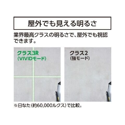 強モードは明るい現場で見やすく、従来品よりも明るい高出力レーザーです。VIVIDモードは強モードの約3倍の明るさで照射できます。