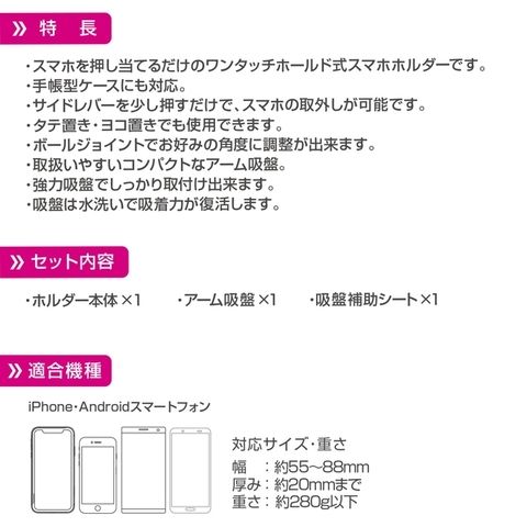 - セット内容:ホルダー本体×1、アーム吸盤×1、吸盤補助シート×1