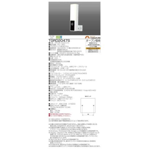 タキズミ 防犯カメラ付センサーライト TAKIZUMI スマートにしっかり防犯 ライトなモデル TGRD2047S 【返品種別A】のレビュー