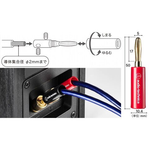 導体集合径2.0mmまでのスピーカーケーブルとの組み合わせが可能。マイナスドライバーだけで、ケーブルを簡単に固定できます。赤と黒のシンプルな筐体で見分けやすく、またプラグ間を絶縁する樹脂筐体のため、ショートを防止します。