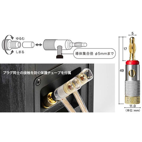 導体集合径5.0mmまでのスピーカーケーブルとの組み合わせが可能。堅牢なメタルボディにケーブルを折り込み、ねじを締めることで確実に固定できます。また、赤と黒のリングにより、セッティングしたケーブルをすぐに見分けられます。
