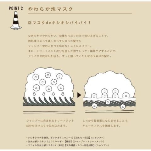 ■成分:水、セテアリルアルコール、アモジメチコン、ジメチコン、加水分解ケラチン(カシミヤヤギ)、加水分解野菜タンパク、フクロフノリエキス、マカデミア種子油、メドウフォーム-δ-ラクトン、レブリン酸、PCA-Na、アルギニン、アスパラギン酸、PCA、グリシン、アラニン、セリン、バリン、イソロイシン、トレオニン、プロリン、ヒスチジン、フェニルアラニン、ラウロイルグルタミン酸ジ(フィトステリル/オクチルドデシル)、シクロヘキサン-1,4-ジカルボン酸ビスエトキシジグリコール、加水分解ヒアルロン酸、セバシン酸ジエチル、ジヒドロキシプロピルアルギニンHCl、加水分解コンキオリンタンパク、グリセリン、エーデルワイス花/葉エキス、酒粕エキス、トウミツ、ココイルアルギニンエチルPCA、EDTA-2Na、BG、ジココジモニウムクロリド、ベヘントリモニウムクロリド、ステアルトリモニウムクロリド、PEG-90M、乳酸Na、乳酸、トコフェロール、DPG、イソプロパノール、エタノール、カラメル、フェノキシエタノール、安息香酸Na、香料