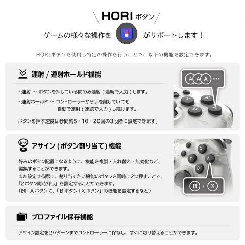 HORIボタンを使用して特定の操作を行うことで、連射 / 連射ホールド機能、アサイン(ボタン割り当て)機能、プロファイル保存機能を設定できます。