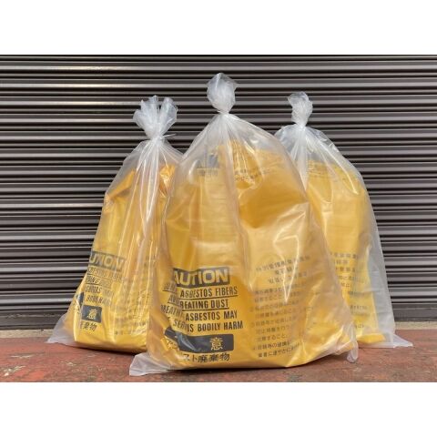 ◆黄色の袋にアスベスト廃棄物注意事項を印刷。