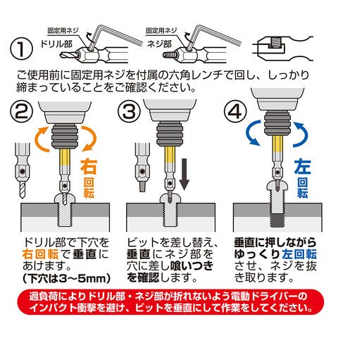 ※過負荷によりドリル部・ネジ部が折れないよう電動ドライバーの