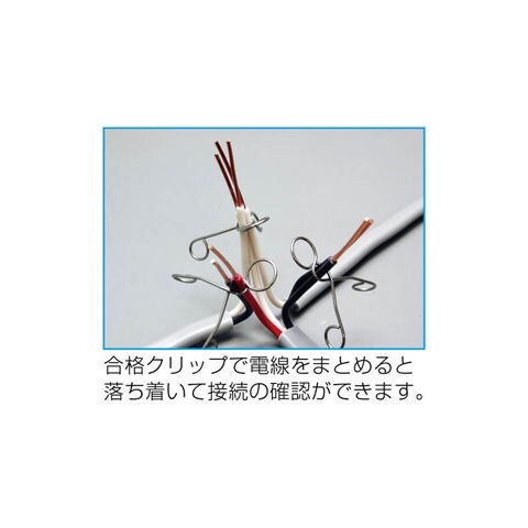 ◆複数の電線を複線図通りに接続するとき、合格クリップを使用し電線をまとめておくと、圧着作業前に配線の事前確認ができ、誤配線を防ぐことができます。