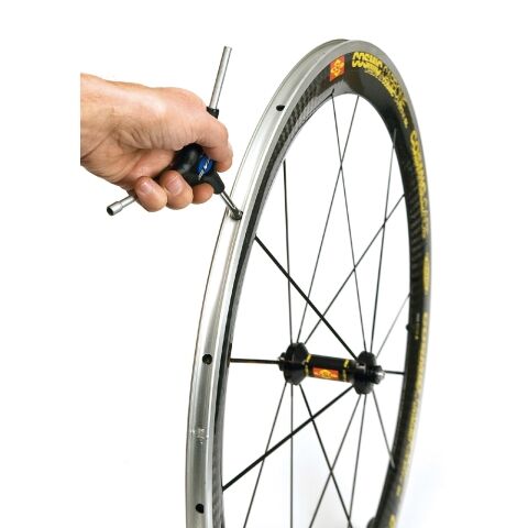 ◆リムの外側からニップルを回し振れ取り調整を行うホイール用のスポークレンチ。