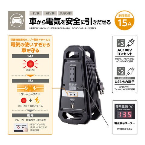 14A (点滅「赤」)、15A ブレーカーダウン (点灯「赤」 + 警告アラーム)、ブレーカーが落ちてしまっても解除スイッチを長押しすることで簡単復帰