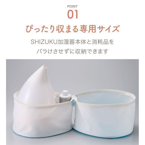 SHIZUKU加湿器にぴったりのサイズ感で、付属品も一緒に収納でき、持ち手付きなので持ち運びする際も便利です。シーズンオフ時に加湿器を傷やホコリから守るだけでなく、パーツをバラけさせずぴったり収納することができるので、購入時の箱を捨ててしまい収納場所に困っている方にもご活用いただけます。