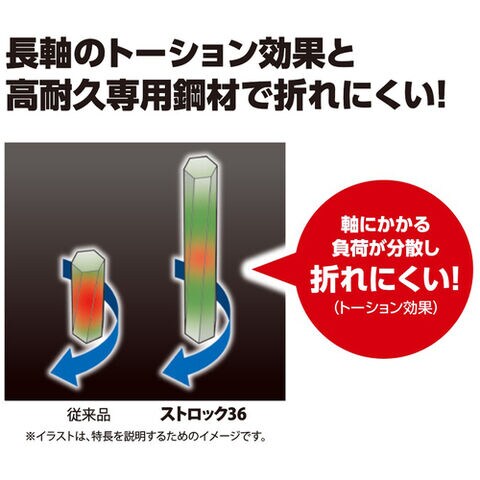軸を長くする事で、軸にかかる負荷を分散し折れにくい。(トーション効果)