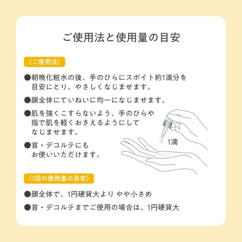 ●朝晩化粧水の後、手のひらにスポイト約1滴分(1円硬貨大よりやや小さめ)を目安にとり、やさしくなじませます。