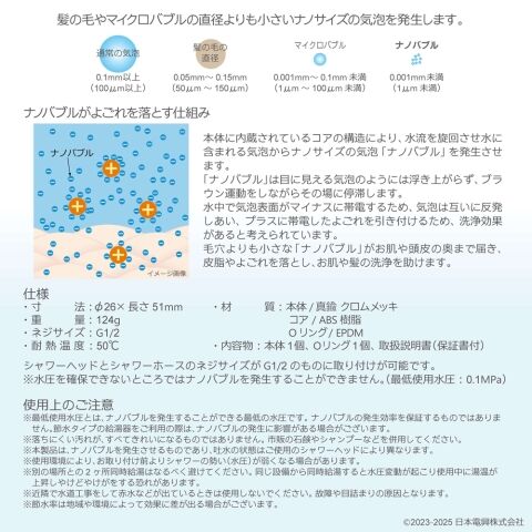 ※本製品は、ナノバブルを発生させるものであり、吐水の状態はご使用のシャワーヘッドにより異なります。