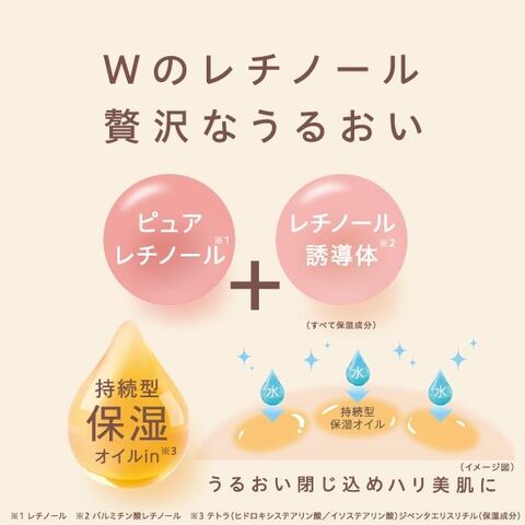 ハリ美肌成分としてWのレチノール(ピュアレチノール※1 × レチノール誘導体※2(すべて保湿成分))を配合。