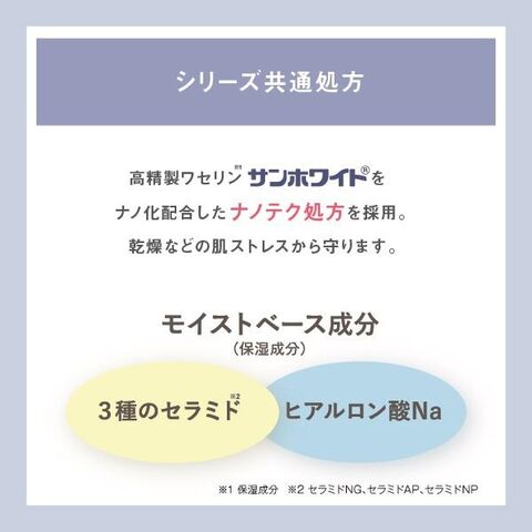 高精製ワセリン サンホワイトⓇ※1をナノ化配合したナノテク処方を採用。乾燥などの肌ストレスから守ります。