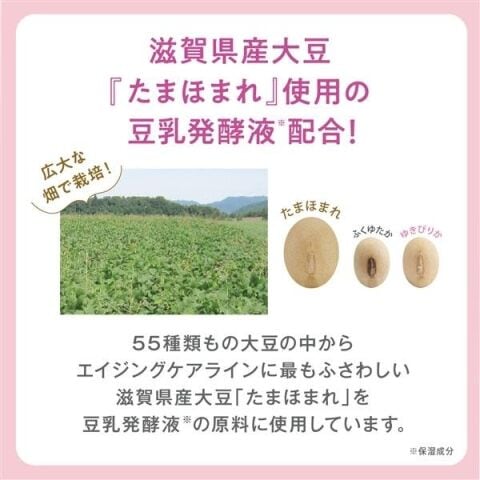 エイジングケアラインにふさわしい大豆「たまほまれ」由来の豆乳発酵液※2 に加えて、肌荒れ防止有効成分(グリチルレチン酸ステアリル)と大人の肌に嬉しいニコチン酸アミド※2、ピュアレチノール※3 を配合。