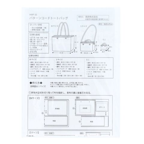 KIYOHARA HAND MADE COLLECTION パターン 型紙 コードトートバッグ セット タグ・レシピ付き HMP-35(キヨハラ) 【返品種別B】のレビュー