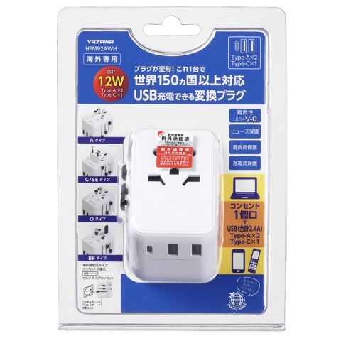 ヤザワ 海外用マルチ変換プラグ(AC×1個口+USB-A×2ポート、Type-C×1ポート) 白利用可能地域:北米・欧州・オセアニア・アジアなど YAZAWA HPM92AWH 【返品種別A】