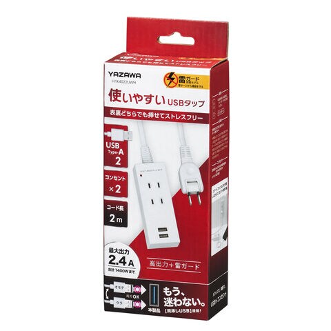 ヤザワ 雷ガード付両挿しUSBタップ(2個口+USB2ポート・2m)ホワイト H1K4022UWH 【返品種別A】