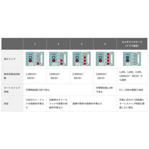 強弱切替(4段)の締付けモード切替機能により幅広い作業に対応します。