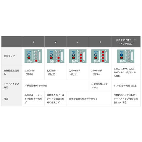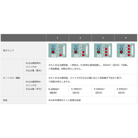 強弱切替(4段)の締付けモード切替機能により幅広い作業に対応します。