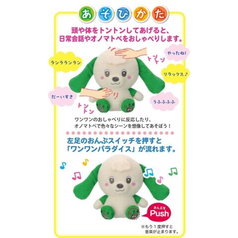 「ワンワン」をトントンしてあげると、日常会話やことばの響きが楽しいオノマトペをおしゃべりしてくれます。