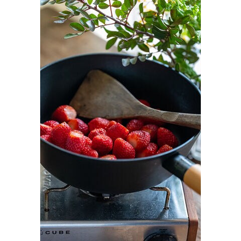 鉄のように黒い本体に、それを引き立たせるナチュラルカラーの木製ハンドル。シンプルなのに飽きのこないデザインにこだわりました。色んな調理に使える軽いマルチパン