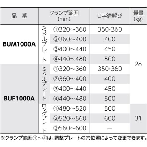 ◆別売部品セットを使用すれば、クランプ範囲:320~480mm(部品品番:BUM1000A)・320~600mm(部品品番:BUF1000A)も対応できます。