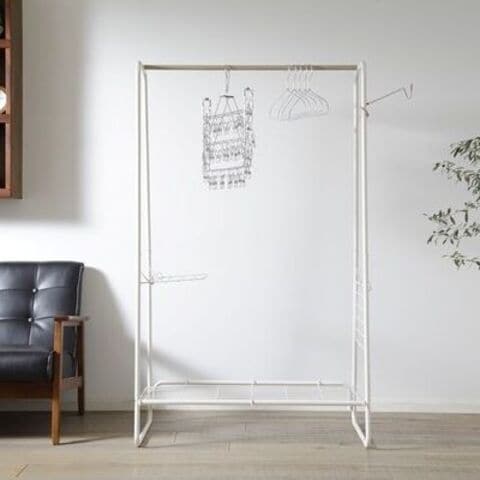 洗濯物を「干して」、乾いたら畳まず「そのまま着る」という、単身世帯の生活スタイルにあわせて開発したインテリアに馴染む新しい室内物干しです。好きな位置に取り付け可能なピンチハンガーバーが付いています。タオルハンガーは、お部屋のレイアウトに合わせて内側と外側に取り付け方を変えることができます。カバンや靴などが置けるメッシュ棚付きです。