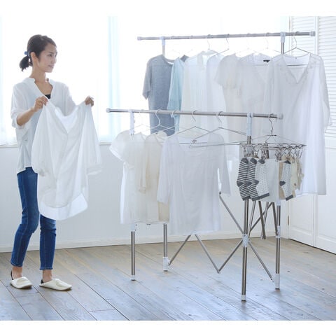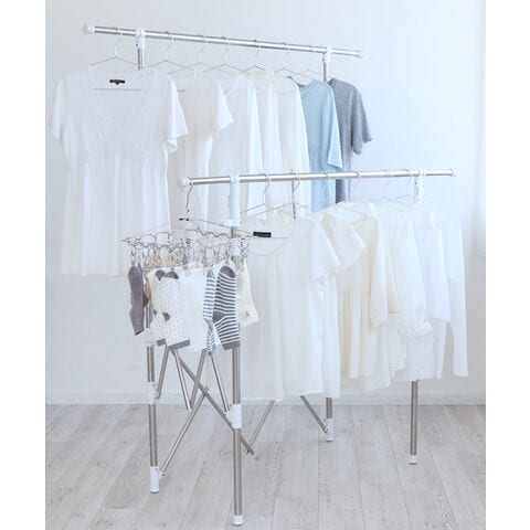 洗濯物の量に合わせて自由自在に伸縮可能。前後の竿は高さを変えられるので