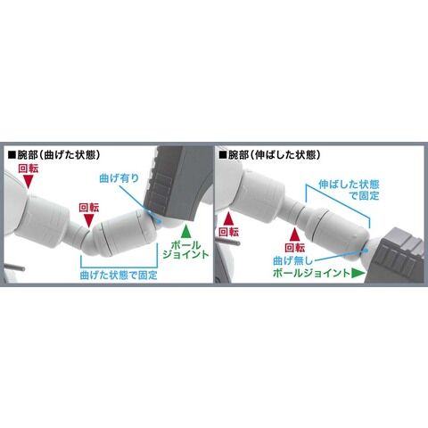 腕部の関節は一部固定式で、曲げた状態と、伸ばした状態の2種の部品をポーズに合わせて差し替える設計。