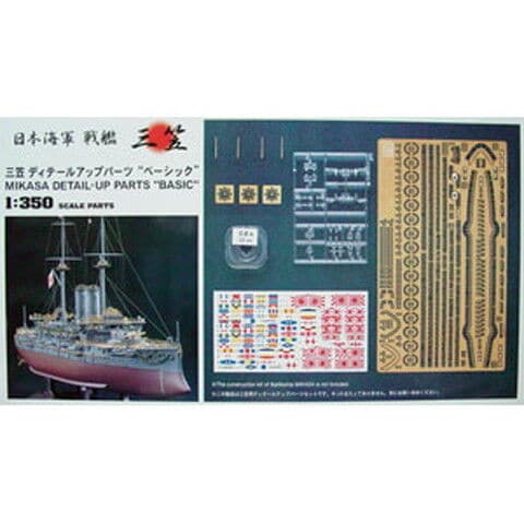エッチング:手すり、キャットウォーク、スタンウォーク、梯子、煙突カバー(プレスあり)1/350スケールの搭乗員(東郷平八郎ほか、多数のポーズ) 真鍮製挽物:主砲の砲身×4(砲口は開口済み) クリアープラ部品:艦橋、サーチライト部品 シール:信号旗(A~Z旗、その他) その他:張り線用テグス(張り線取り付け用のガイド図付)