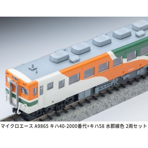 A9863 キハ58+キハ40小倉試験色(2025年発売予定)を基にしたバリエーションモデル アイボリー地に緑・オレンジ帯で塗装された「水郡線色」2形式をセット S字を描く側面帯の形状、前面帯の幅の違いなど、2両の違いを再現 キハ58-117は長編成化非対応車。エンジン換装前の姿 キハ40-2024は非冷房、ワンマン化改造前 キハ40-2024の窓下のグリル、給水孔は印刷で再現 1990年頃の姿、所属表記「水タイ」を印刷 ヘッドライト・テールライト・前面表示器点灯(ON-OFFスイッチ付)