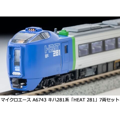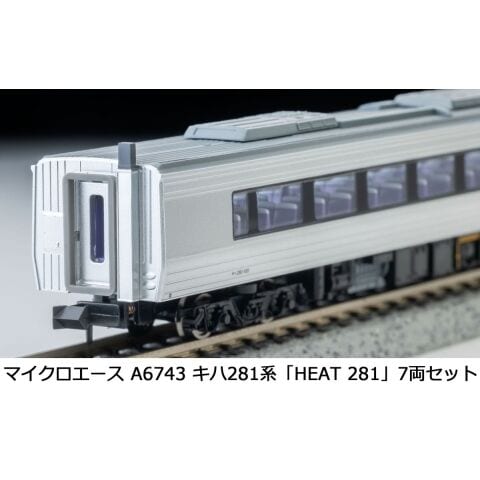 A6742(2023年6月出荷)を基にしたバリエーション商品 「スーパー北斗」デビュー当時のキハ281系を製品化。運転室側面に 「HEAT281」 ロゴマークを印刷 車体色の青、銀色は A6742 で好評の改良版を使用 グリーン車、多目的室付普通車を連結した登場当初のベーシックな7両編成。当セット単独で走行可能 別売の A6744 や A6755 を連結する事で、多客時の8両・9両編成も再現可能